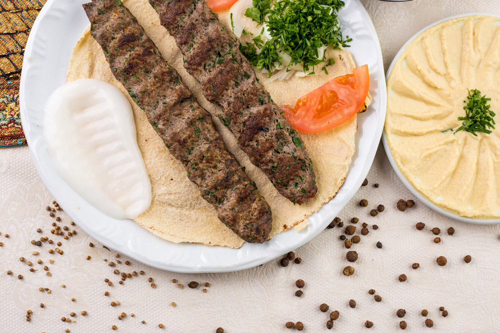 قطعتين من الكفتة , حمص , تبولة , خبز عربي