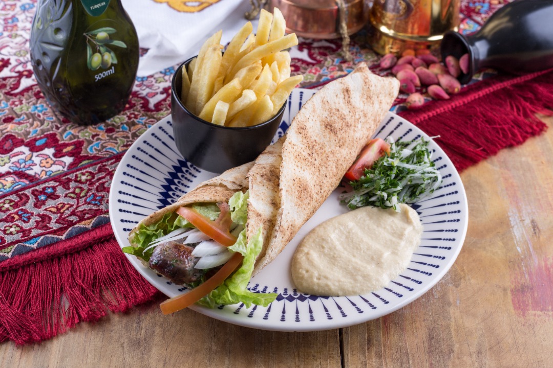 خبز سوري ، حمص ، خس ، طماطم ، بصل على الطبق وسيخ كباب